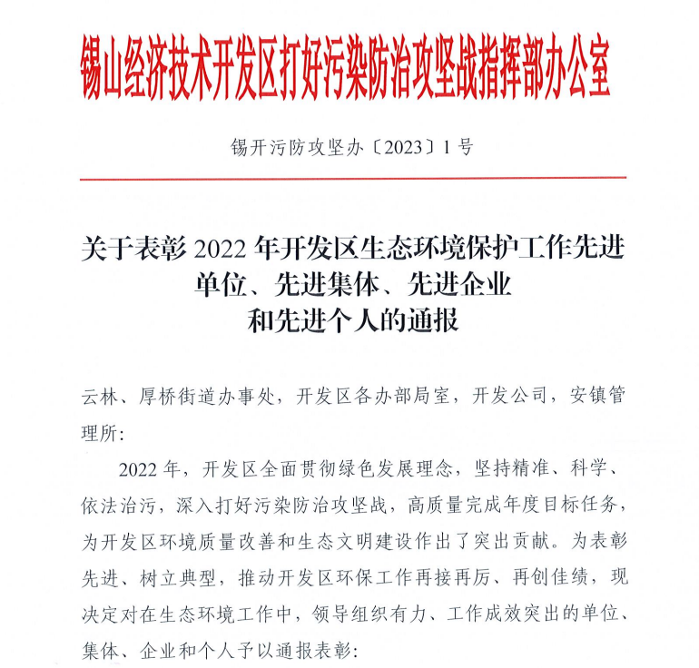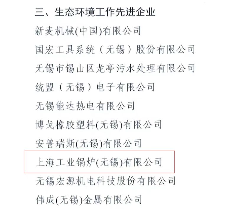 近日,錫山經(jīng)濟(jì)開發(fā)區(qū)污防攻堅辦表彰開發(fā)區(qū)生態(tài)環(huán)境保護(hù)工作先進(jìn)單位、集體、企業(yè)和個人,上海工業(yè)鍋爐(無錫)有限公司榮獲“生態(tài)環(huán)境工作先進(jìn)企業(yè)”稱號。