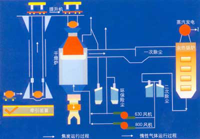 干熄焦技術是利用冷的惰性氣體(燃燒后的廢氣),在干熄爐中與赤熱紅焦換熱從而冷卻紅焦。吸收了紅焦熱量的惰性氣體將熱量傳給干熄焦鍋爐產生蒸汽,被冷卻的惰性氣體再由循環風機鼓入干熄爐冷卻紅焦。干熄焦鍋爐產生的蒸汽或并入廠內蒸汽管網或送去發電。二者在逆向運動中,焦炭逐漸被冷卻到250℃以下,然后由爐底的卸料裝置排出;同時,惰性氣體(或廢煙氣)被加熱到800℃左右,從干熄爐斜道口經過一次除塵器后進入干熄焦鍋爐;在鍋爐中,水被熱氣流加熱產生蒸汽,同時氣體被冷卻到200℃左右,再經二次除塵由循環風機重新送入干熄爐內循環使用。